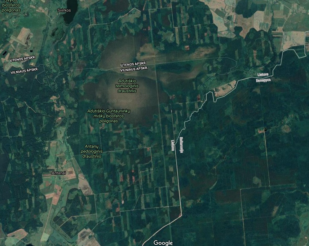 Skubėti reikia, nes gali greit nebelikti ką kirsti. Įsijunkit Google žemėlapius ir pasigėrėkit. Šioje nuotraukėlėje Lietuvos ir baisiosios tiranozaurų Baltarusijos siena. Mūsų pusėje miškas kaip šachmatų lenta, mirgėte mirga šviesūs pažangos lopinėliai – tai kirtimai. Kad smalsiems piliečiams būtų aišku, žemėlapyje parašyta – tai draustiniai ir saugomos teritorijos.