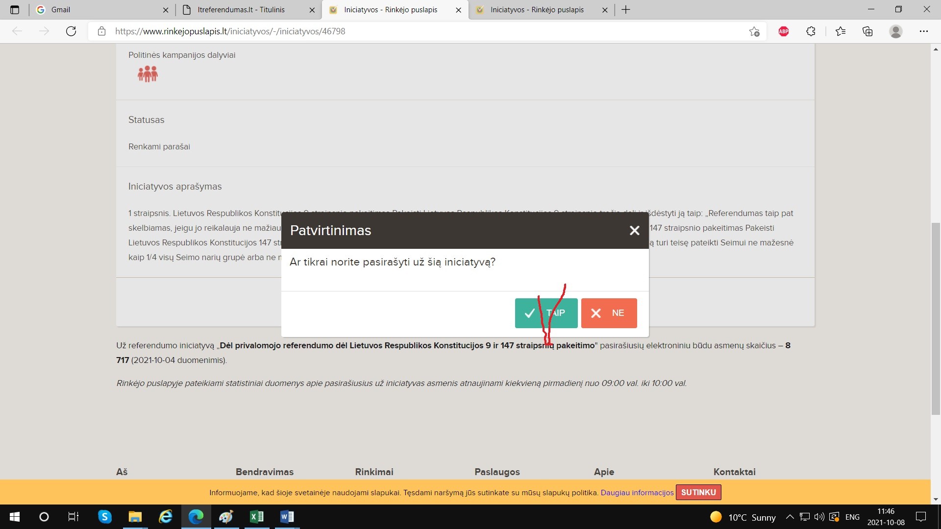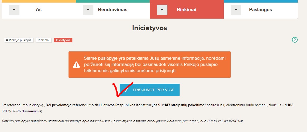 - Prisijungiame prie VRK rinkėjo puslapio adresu: Iniciatyvos – Rinkėjo puslapis (rinkejopuslapis.lt) ir spaudžiame “PASIRAŠYTI“