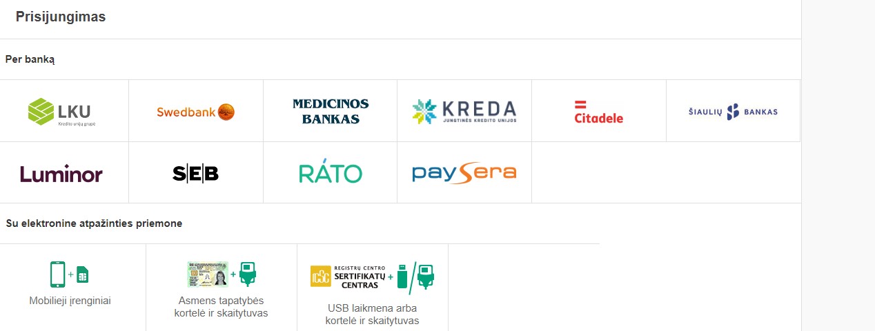 5. Pasirenkame prisijungimą per banką arba mobiliuoju parašu IR PRISIJUNGIAME: