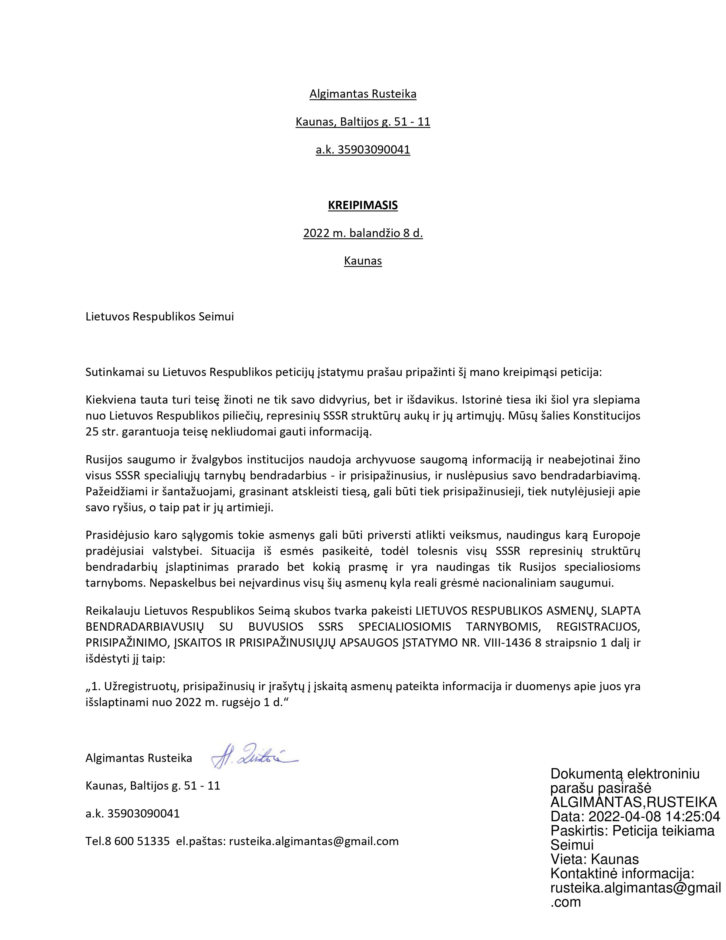 1. Vadovaujantis istorinio teisingumo ir valstybės saugumo interesais, reikalauja Lietuvos Respublikos Seimą nedelsiant svarstyti ir pakeisti “Lietuvos Respublikos asmenų, slapta bendradarbiavusių su buvusios SSRS specialiosiomis tarnybomis, registracijos, prisipažinimo, įskaitos ir prisipažinusiųjų apsaugos įstatymą Nr. VIII-1436“ bei kitus įstatymus ir viešai paskelbti šių asmenų sąrašą.