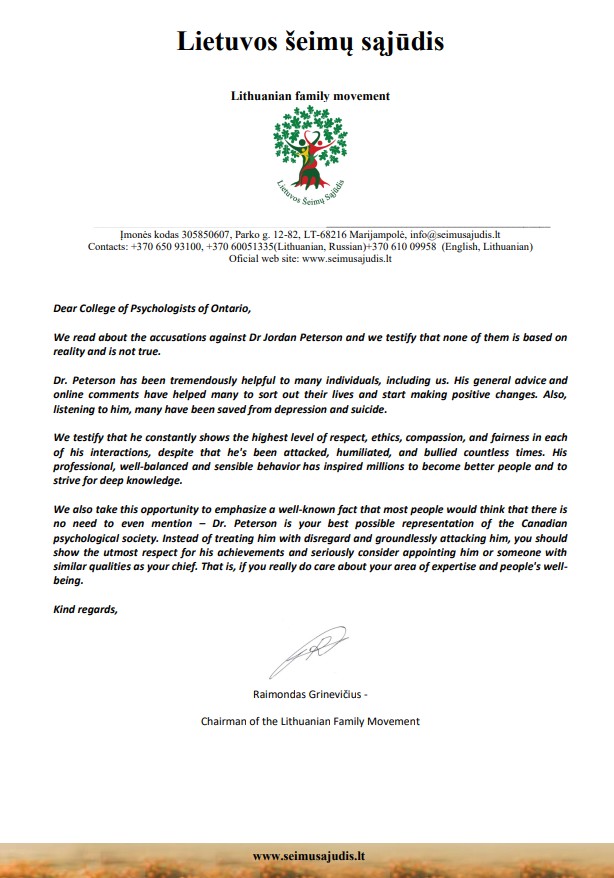 Mes perskaitėme jūsų kaltinimus dr. Džordanui Petersonui ir liudijame, kad nė vienas iš jų nėra pagrįstas tikrove ir nėra tiesa.