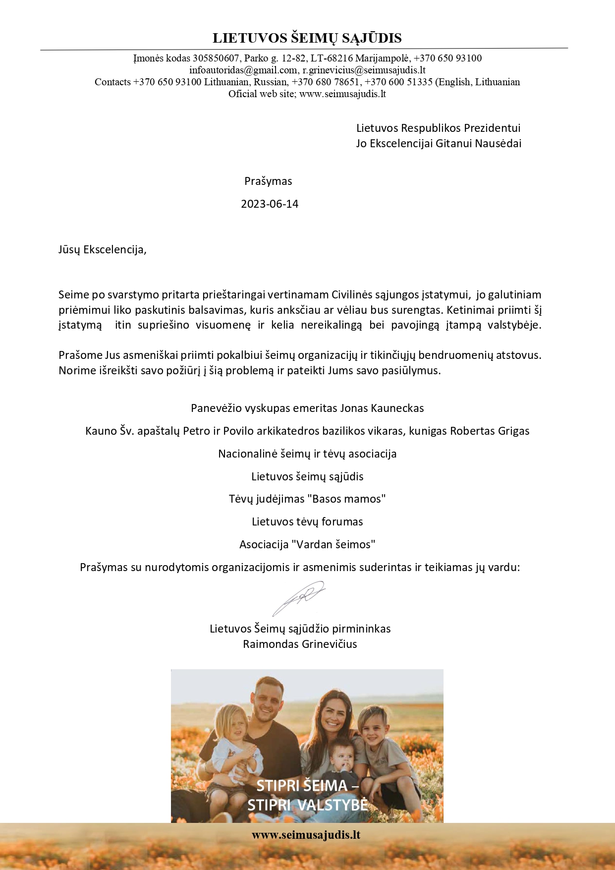 Prašome Jus asmeniškai priimti pokalbiui šeimų organizacijų ir tikinčiųjų bendruomenių atstovus. Norime išreikšti savo požiūrį į šią problemą ir pateikti Jums savo pasiūlymus.