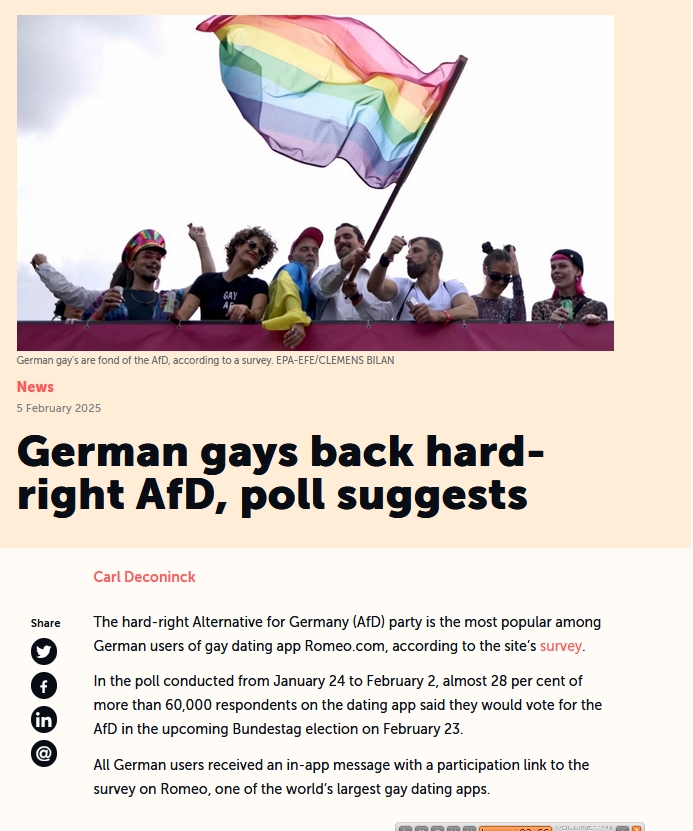 Tarp vokiečių gėjų rinkimuose triuškinančiai pirmauja AfD, surinkusi 27,9 proc. balsų. Ypač ji populiari taro 18-24 m. amžiaus gėjų – net 34,7 proc. Žalieji tesukrapšto tik 19 proc., kiti dar toliau.